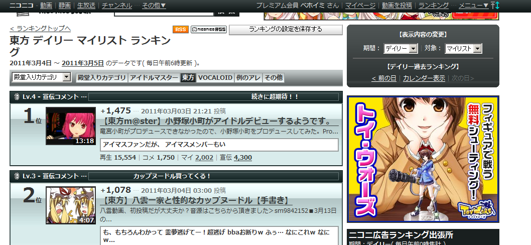 2011年3月4日 ~ 2011年3月5日のデイリーマイリストランキングにて