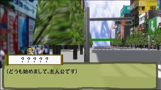 ビルの屋上を見上げるにはどうしてもビルから距離を取る必要があったので、やむを得ず主人公さんには車道にはみ出して歩いて頂いてます